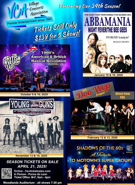 All VCA concerts are held at the Woodlands Auditorium in the Ponce de Leon Center at 1101 DeSoto Boulevard in Hot Springs Village. 7:30 pm; doors open 6:45 pm